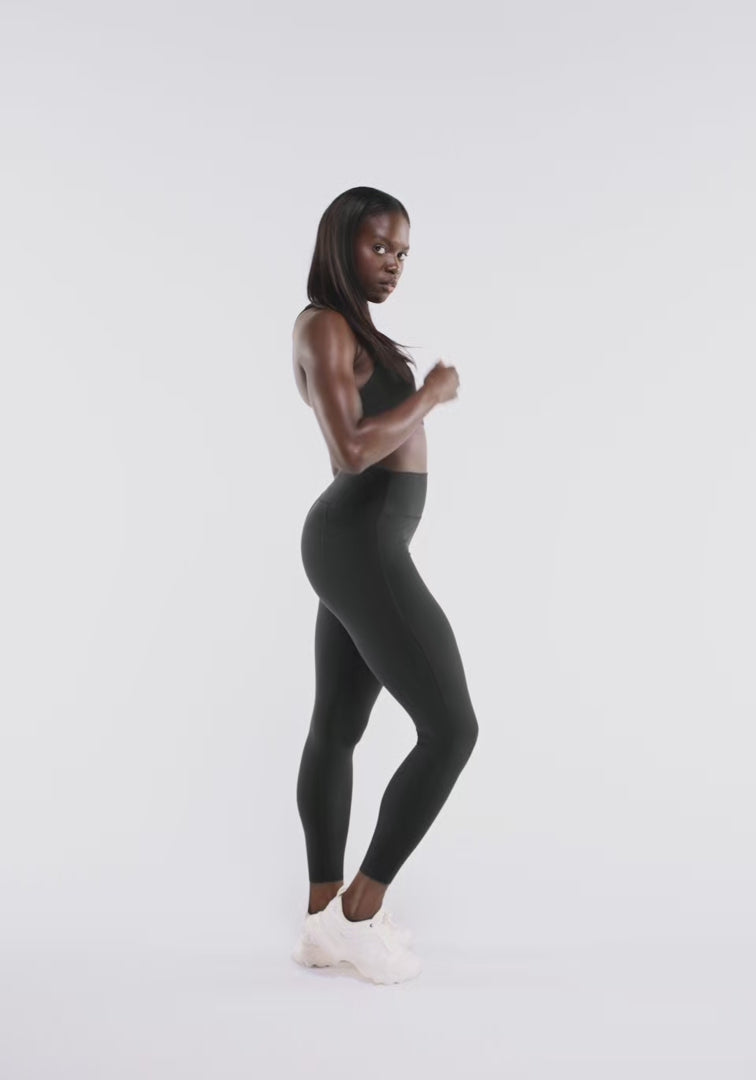 High rise, 25" inseam legging with medium compression, side pockets, and elongated gusset