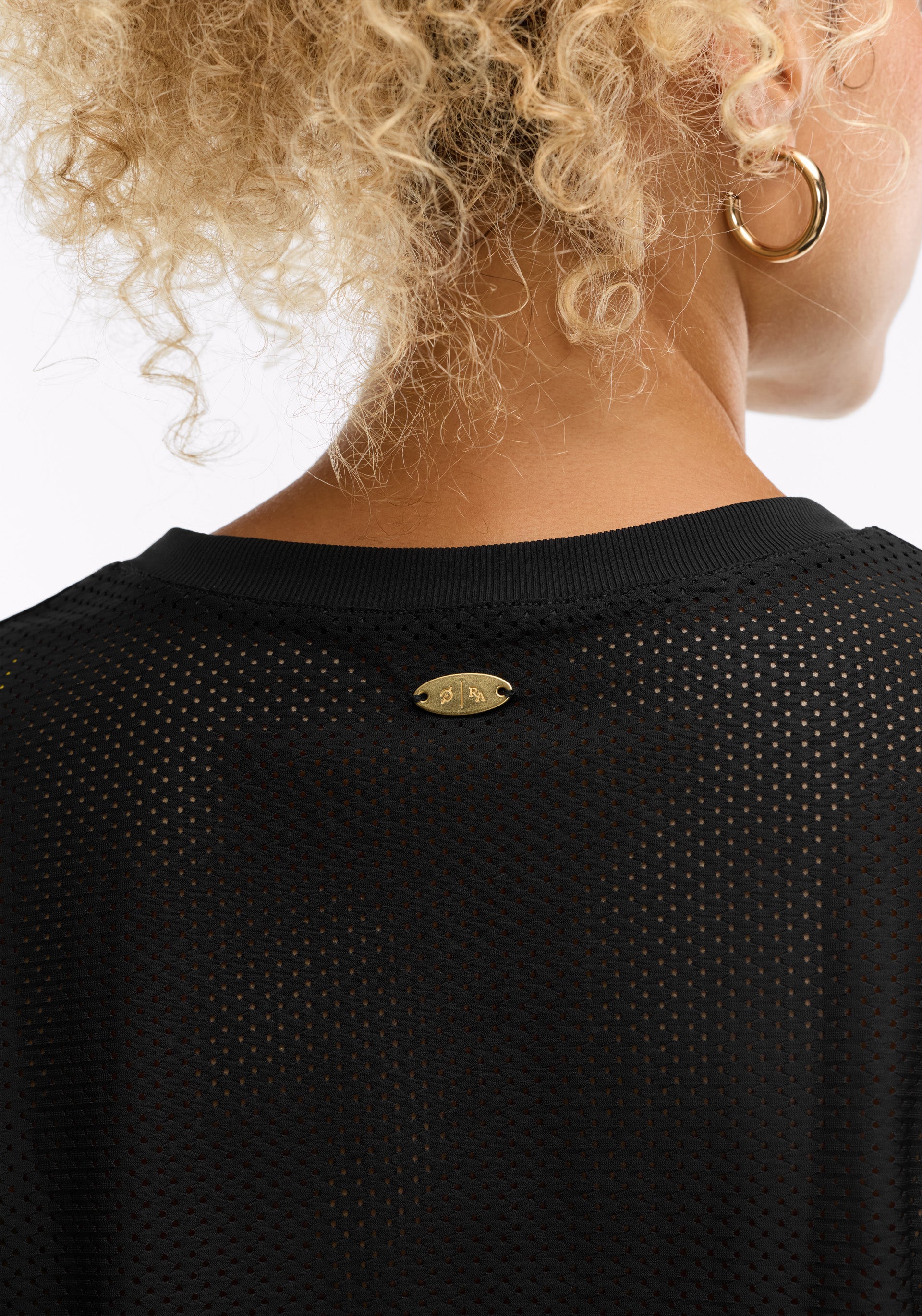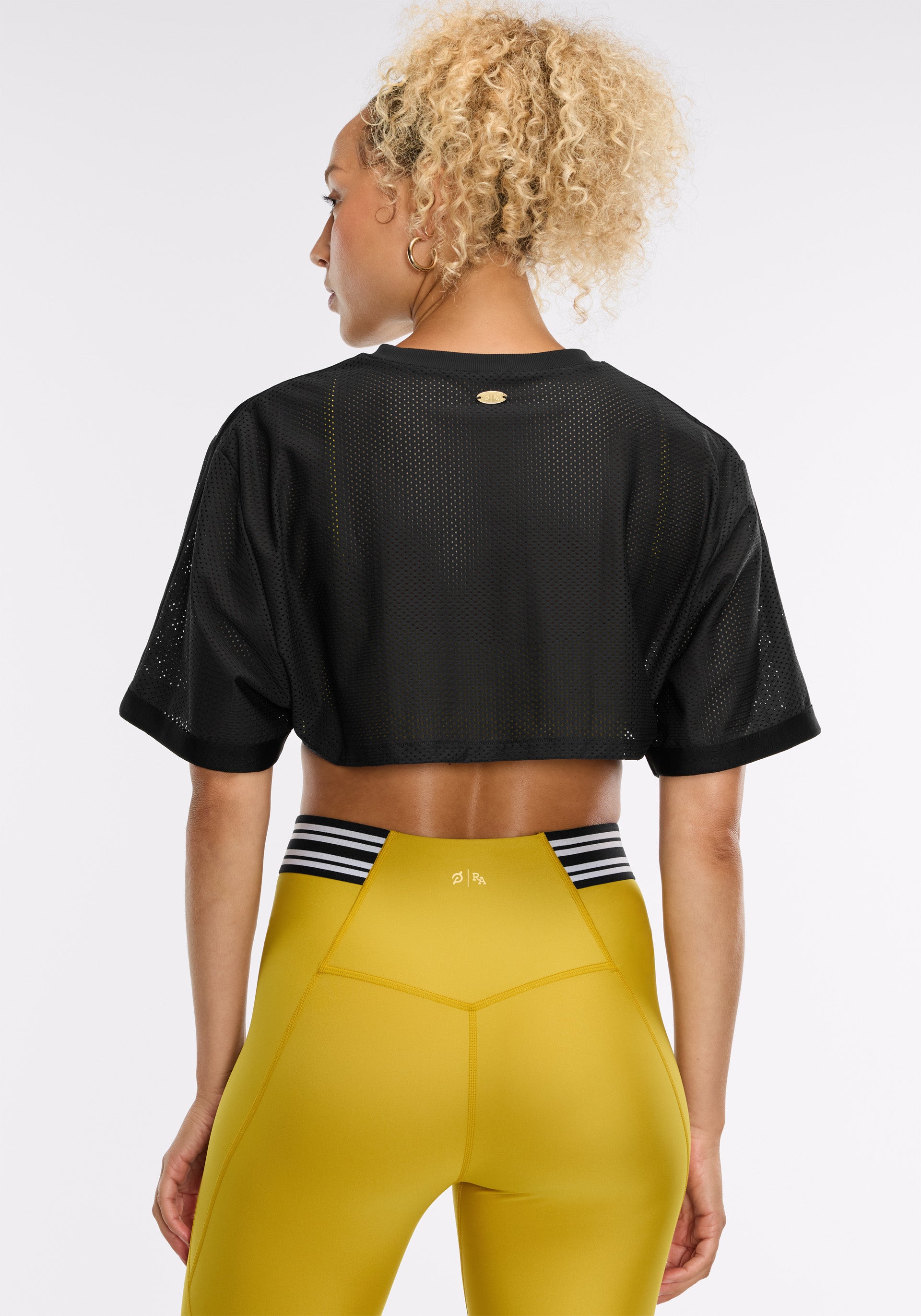 • Cropped, jersey style short sleeve with rib trim at neck and taping at sleeves