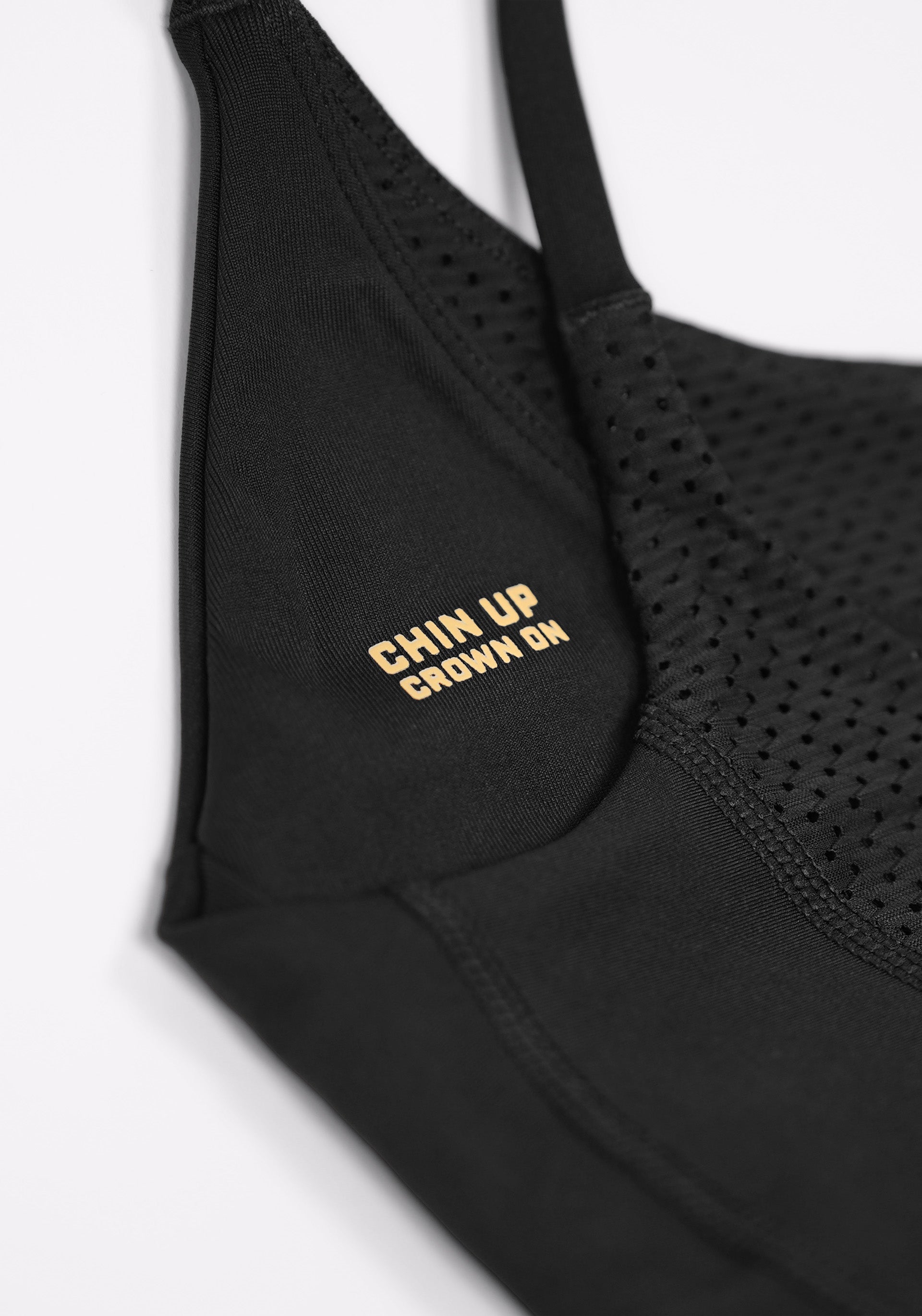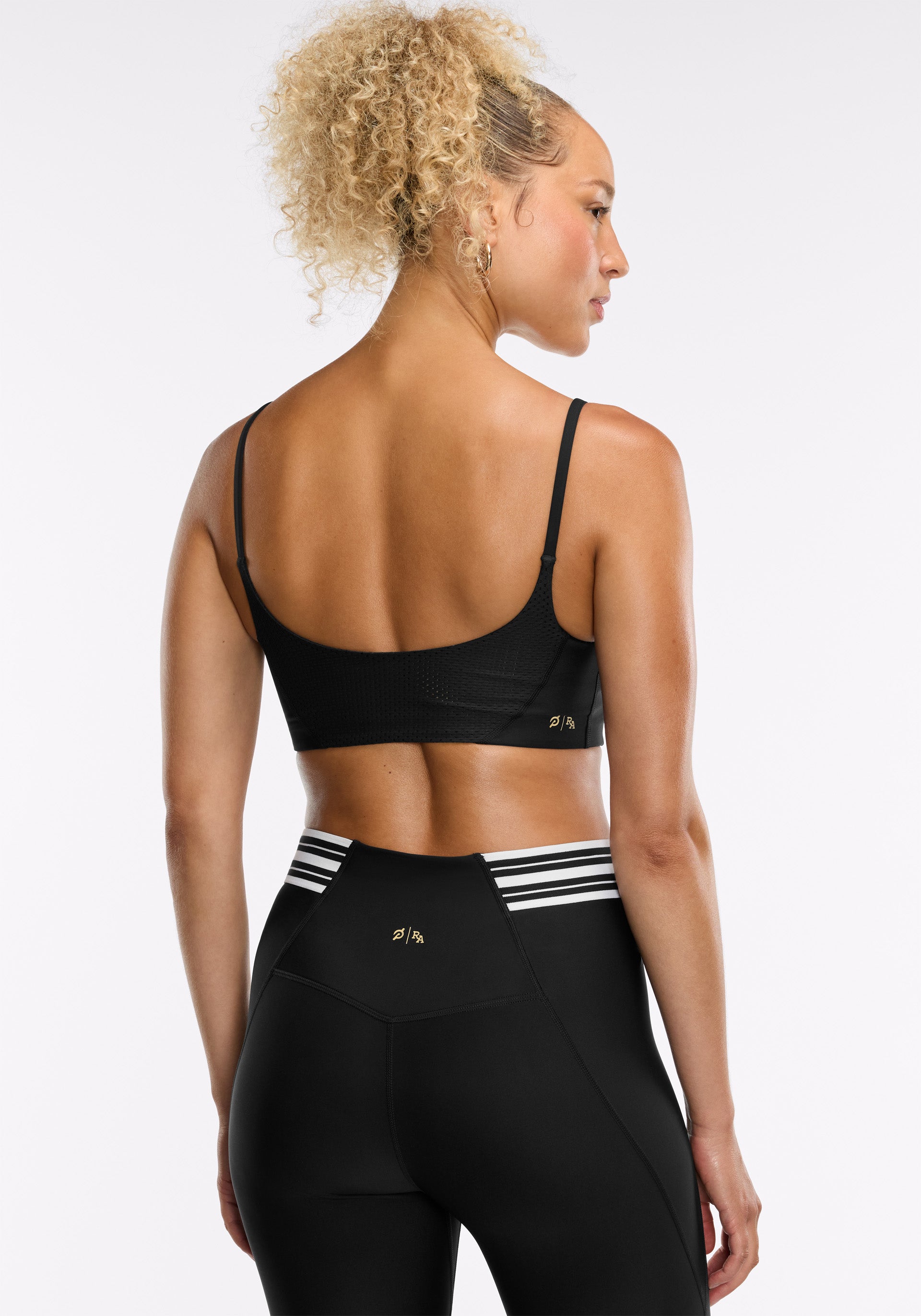 • Low-Medium support bra with mesh panels at front and back, elastic bottom band, and interior cup pockets