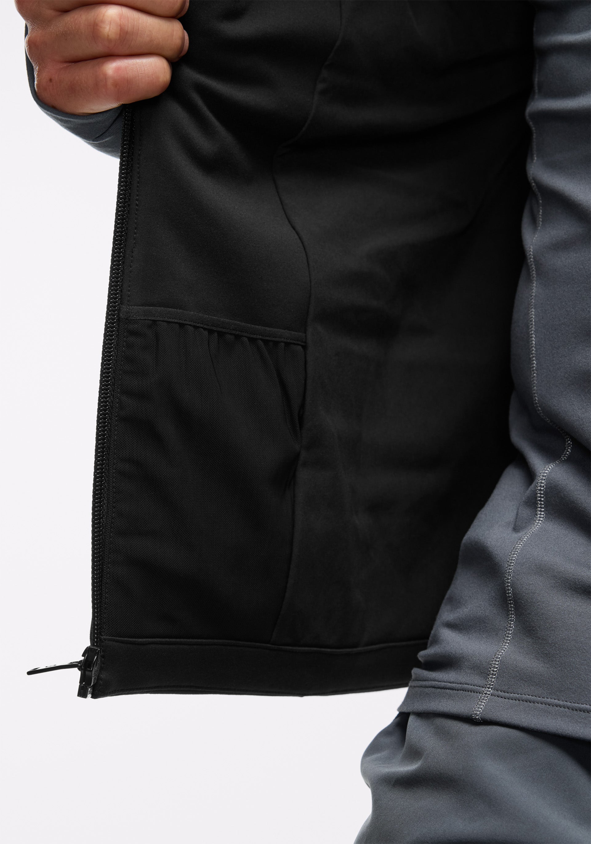 Padded vest with reflective style lines and zipper, side zip pockets, and interior mesh pockets