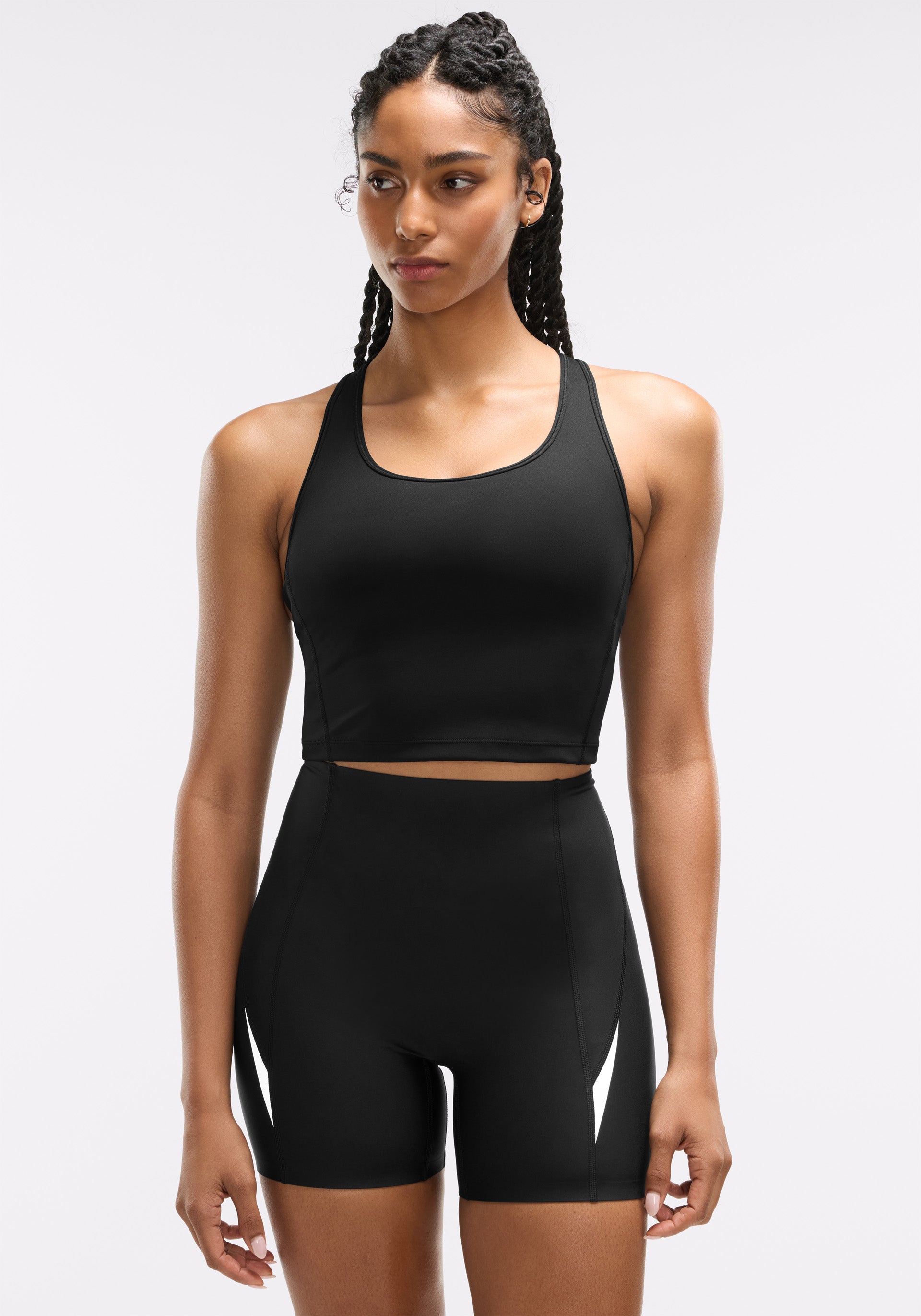 Racerback tank with interior shelf bra, lower back mesh panel for ventilation, and stash pocket at racerback