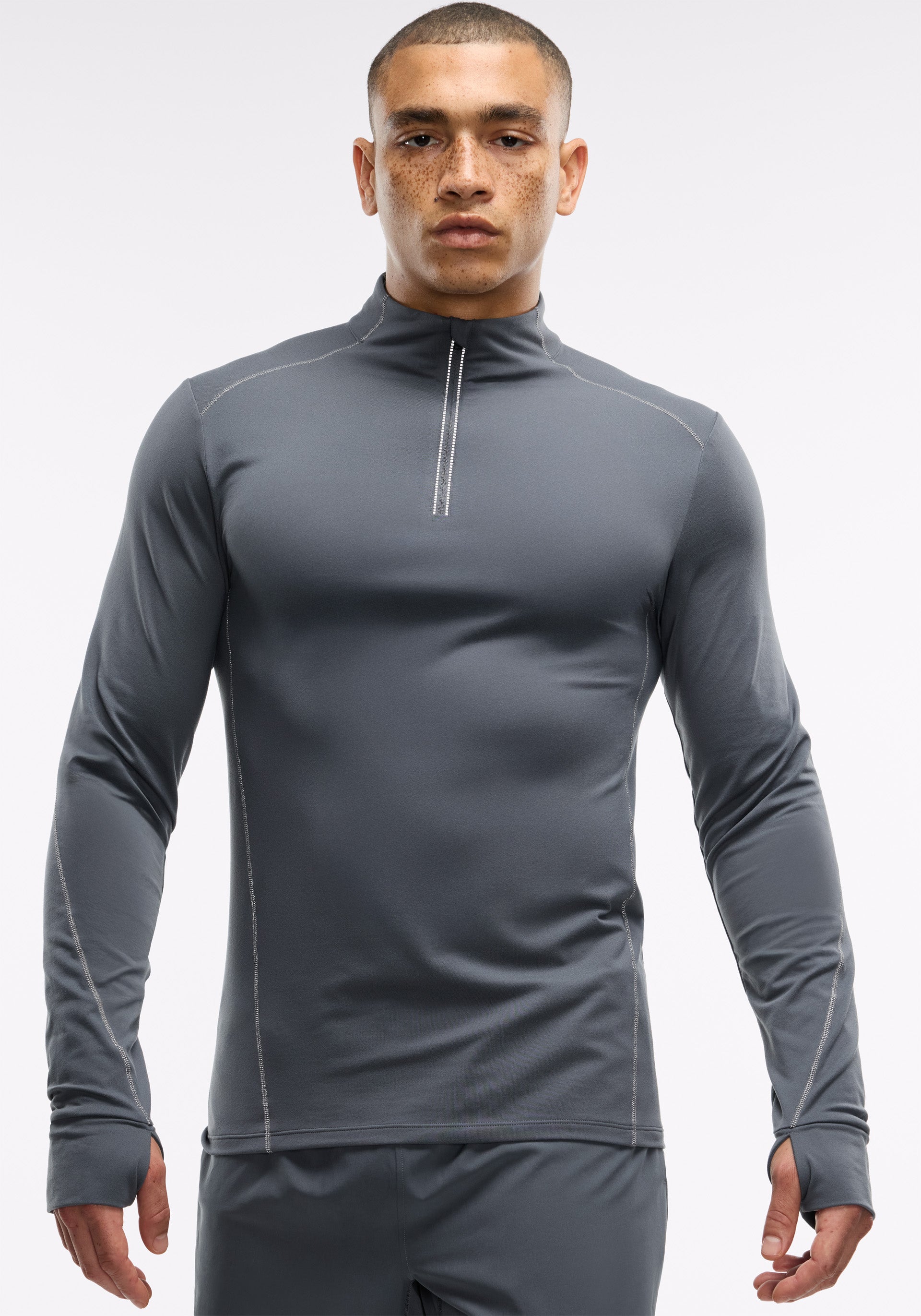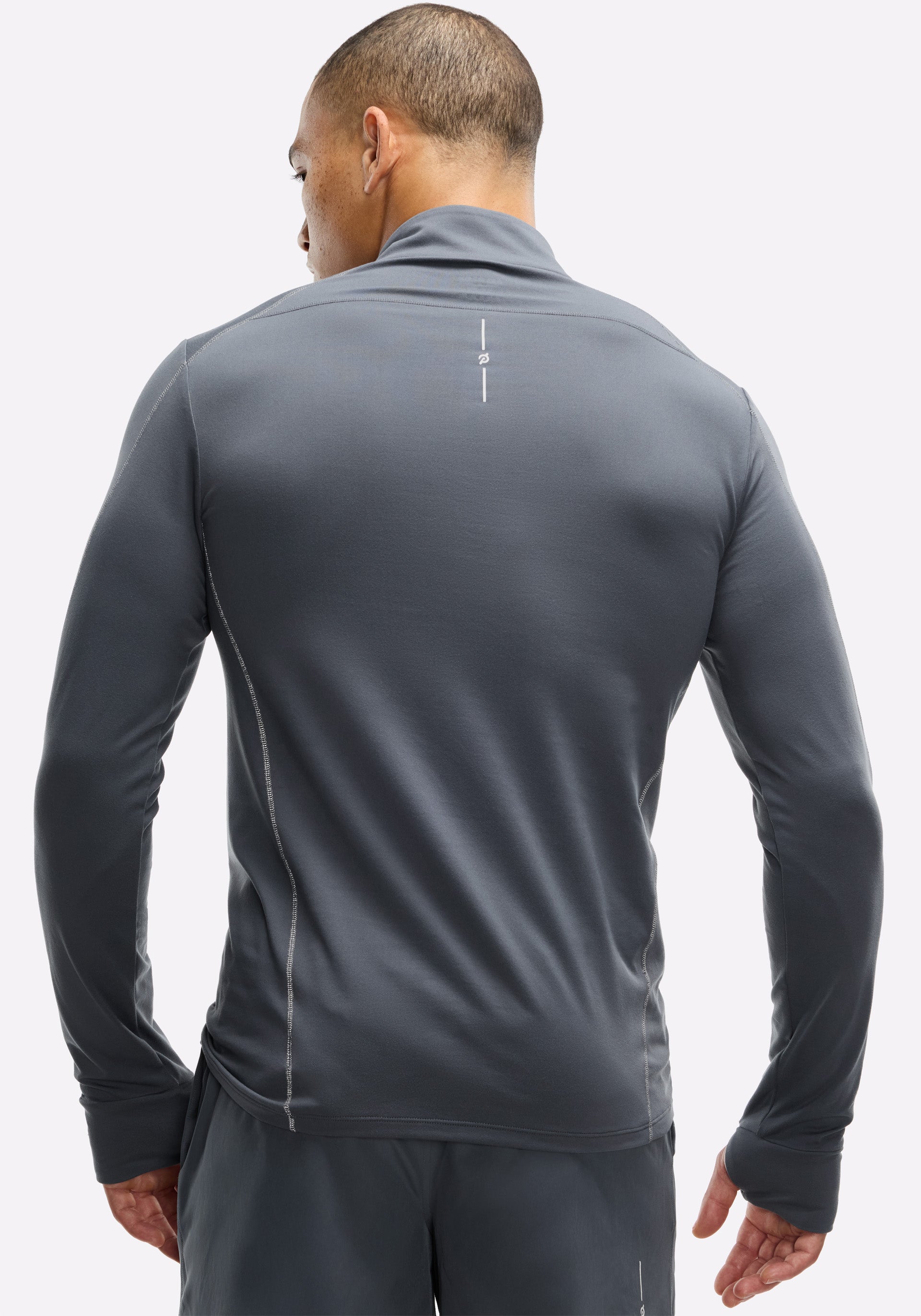 • Mock neck quarter zip with reflective zipper placket, thumbholes, and reflective contrast style lines