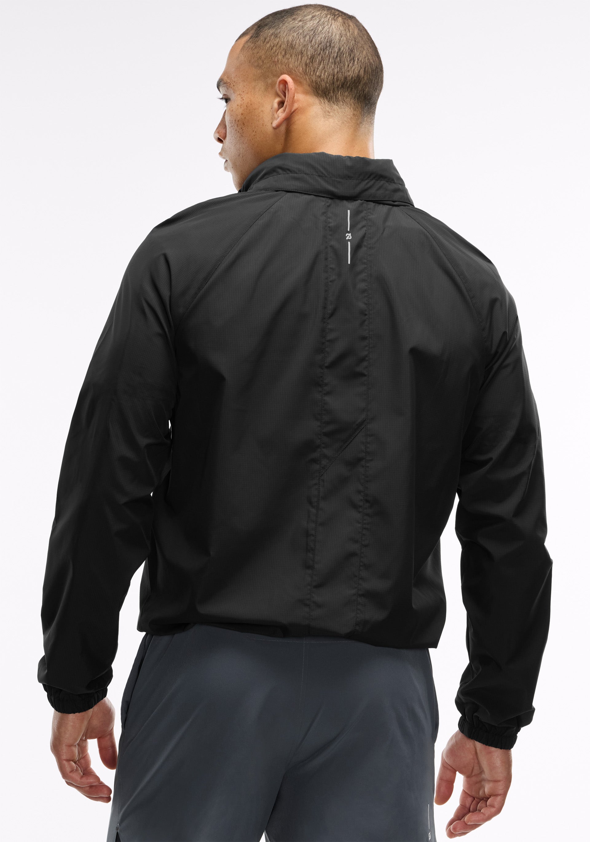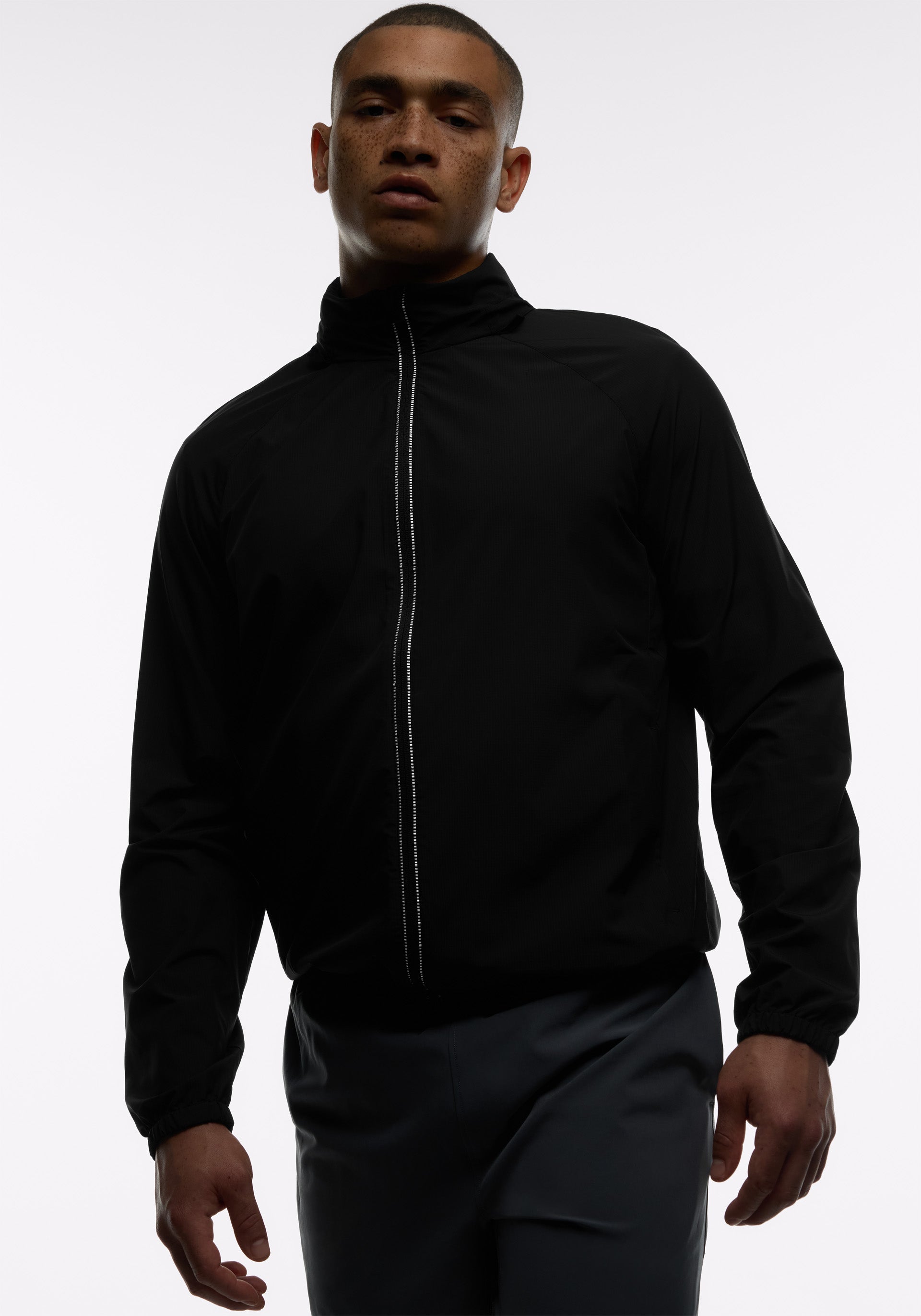 Full zip jacket with zipper garage, elastic at hem and cuffs, zippered hand pockets, and packable hood
